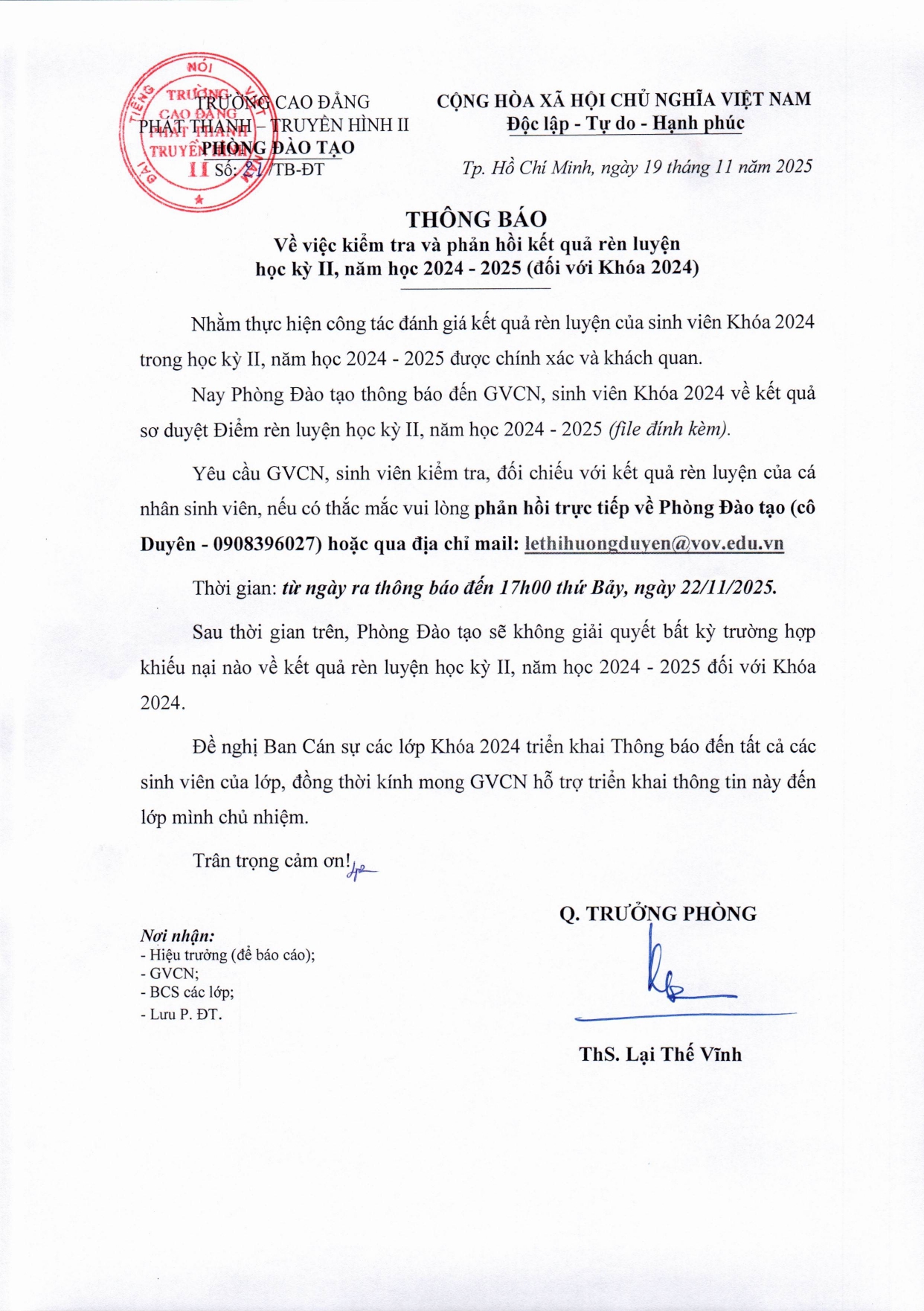 Thông báo về việc kiểm tra và phản hồi kết quả điểm rèn luyện học kỳ II, năm học 2024-2025 (đối với khóa 2024)