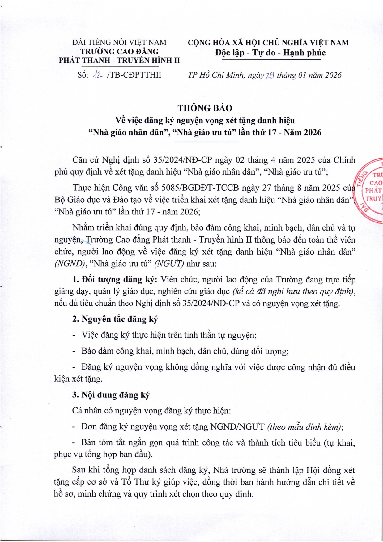 Thông báo về việc đăng ký nguyện vọng xét tặng danh hiệu “Nhà giáo nhân dân”, “Nhà giáo ưu tú” lần thứ 17 - Năm 2026