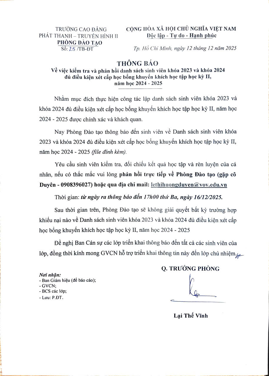 - Danh sách sinh viên khóa 2023 đủ điều kiện xét cấp học bổng khuyến khích học tập học kỳ II năm học 2024 - 2025 (Tải về)