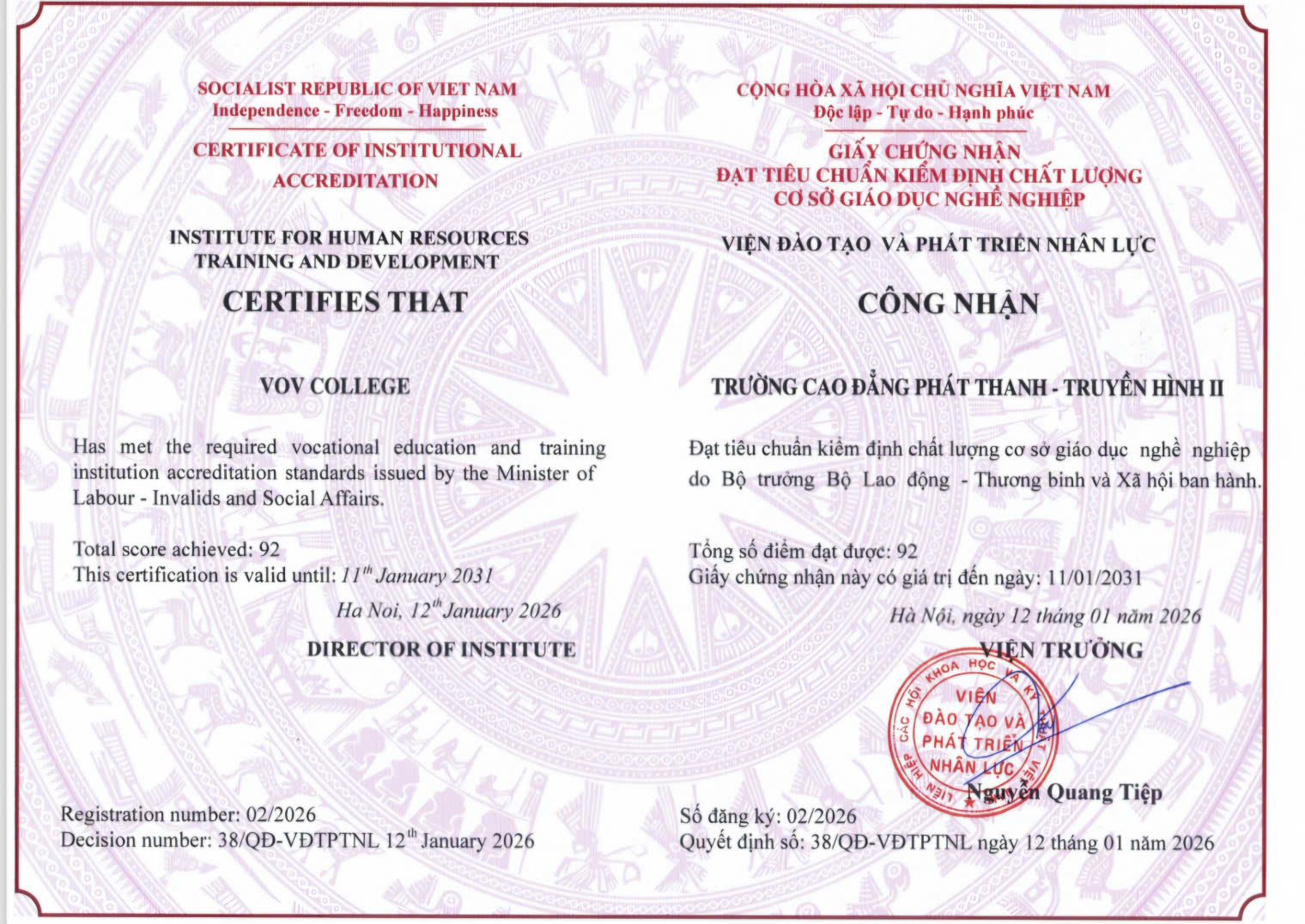 1. Ngày 12.01.2026, VOVC được cấp Giấy phép Kiểm định cơ sở giáo dục nghề nghiệp với 92/100 ₫iểm. Đây là sự Cam Kết của VOVC với xã hội và người học về chất lượng đào tạo và hướng tới sự chuyên nghiệp.