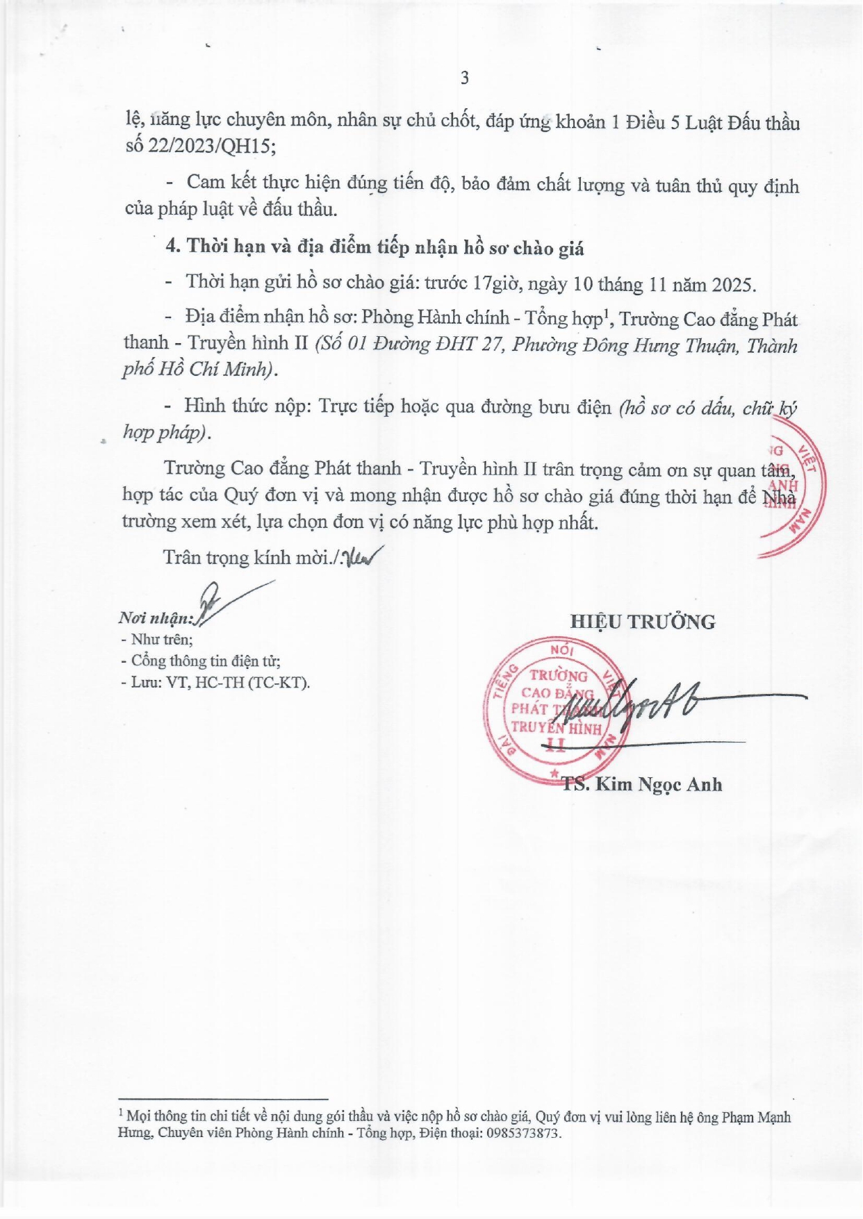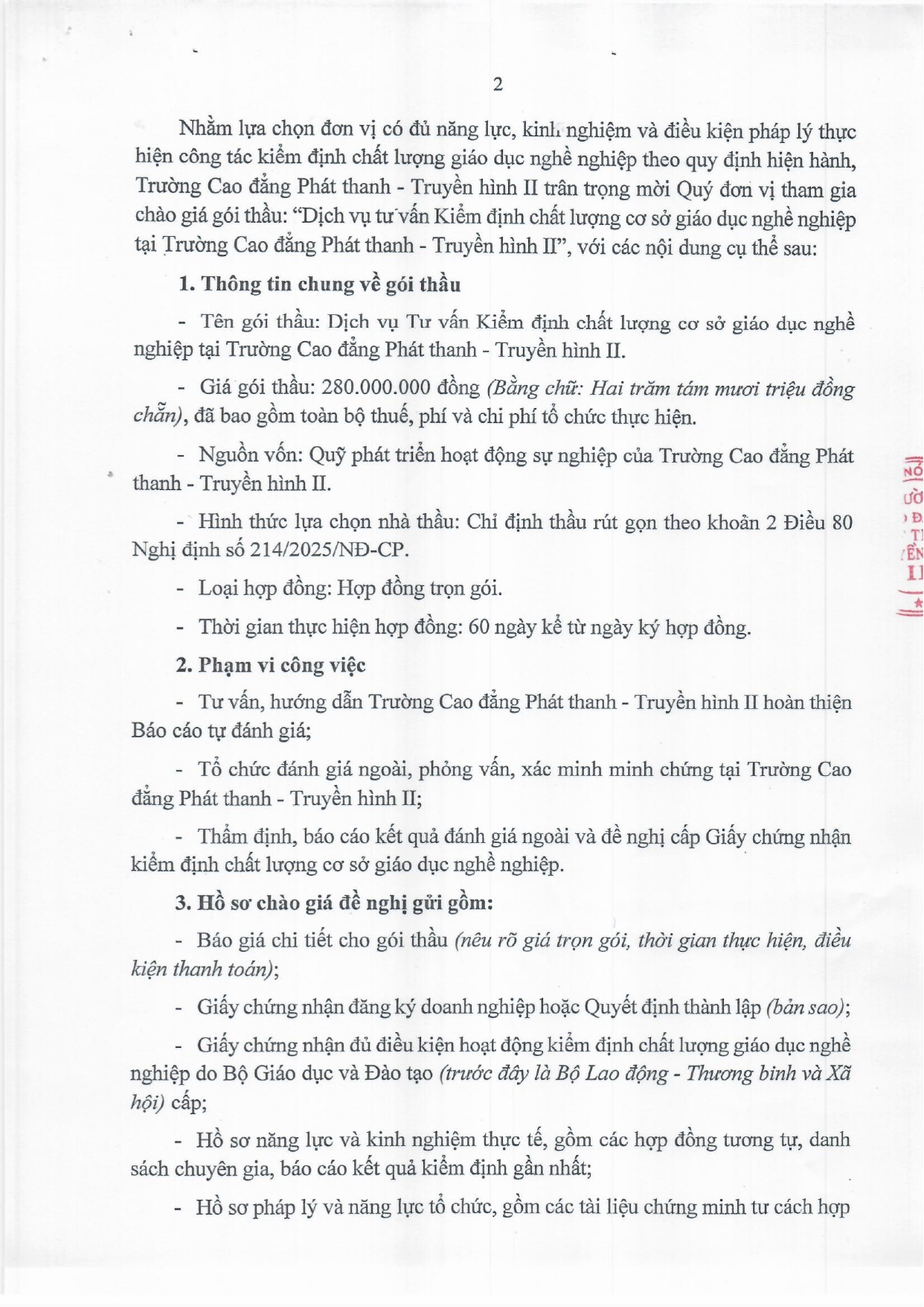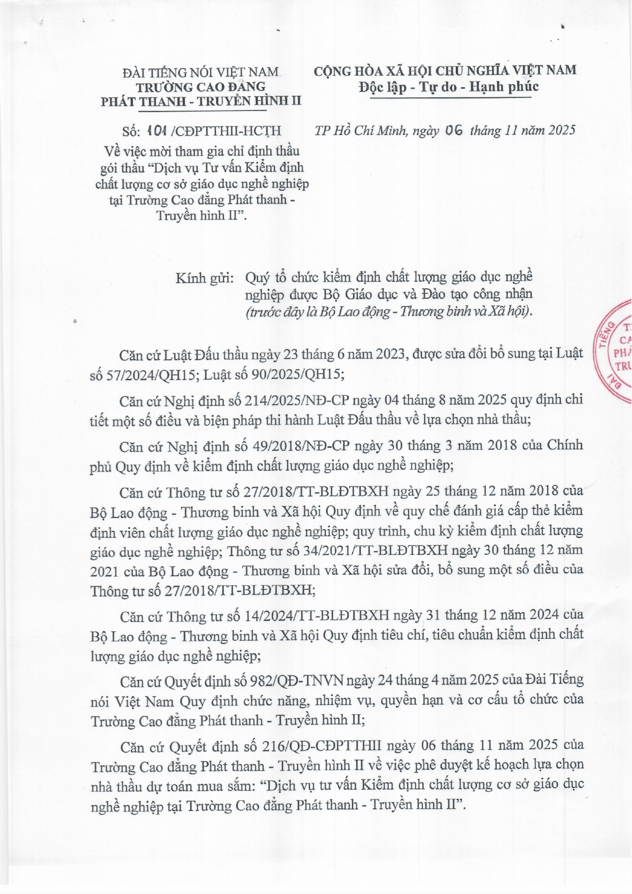 Công văn về việc mời tham gia chỉ định gói thầu "Dịch vụ Tư vấn Kiểm định chất lượng cơ sở giáo dục nghề nghiệp tại Trường Cao đẳng Phát thanh - Truyền hình II"