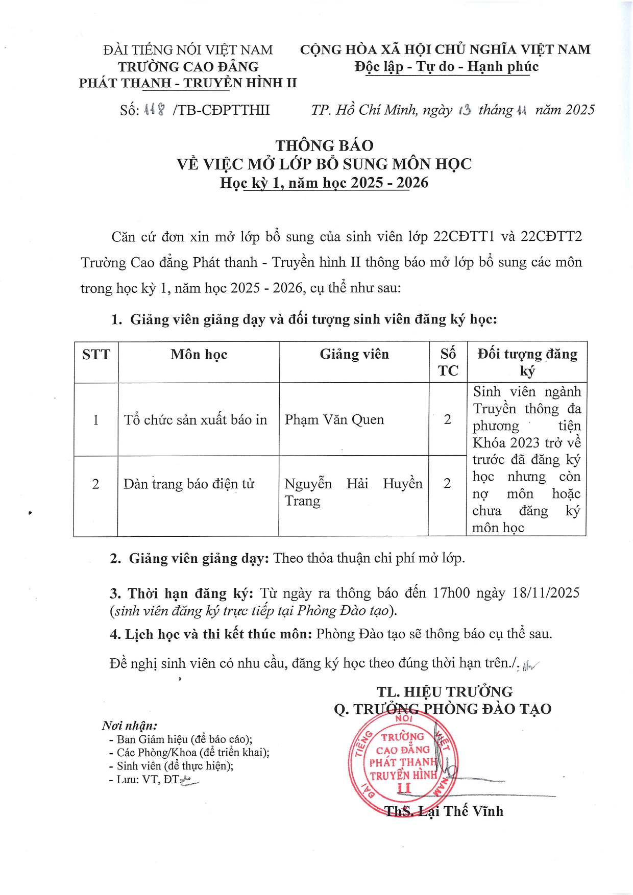 Thông báo về việc mở lớp bổ sung môn học học kỳ I, năm học 2025-2026