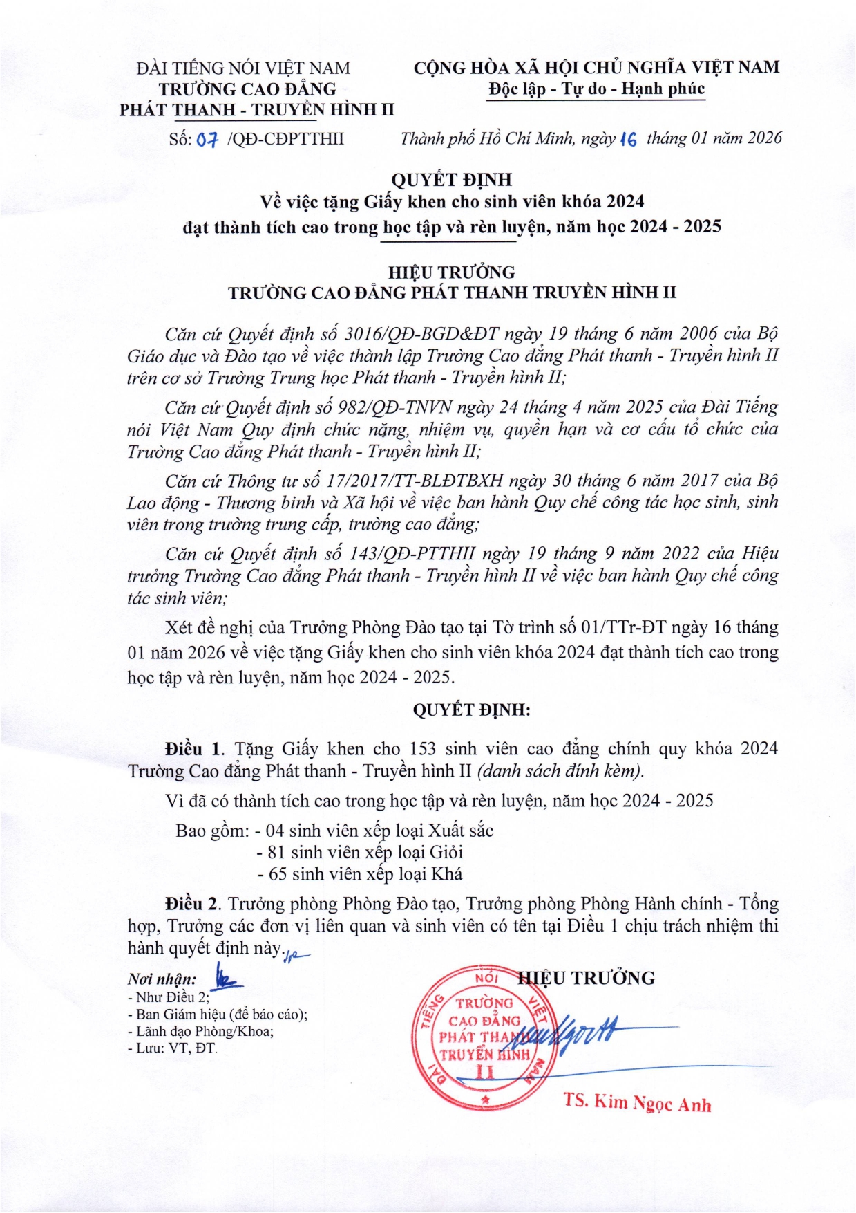 Quyết định về việc tặng Giấy khen cho sinh viên khóa 2024 đạt thành tích cao trong học tập và rèn luyện, năm học 2024 - 2025