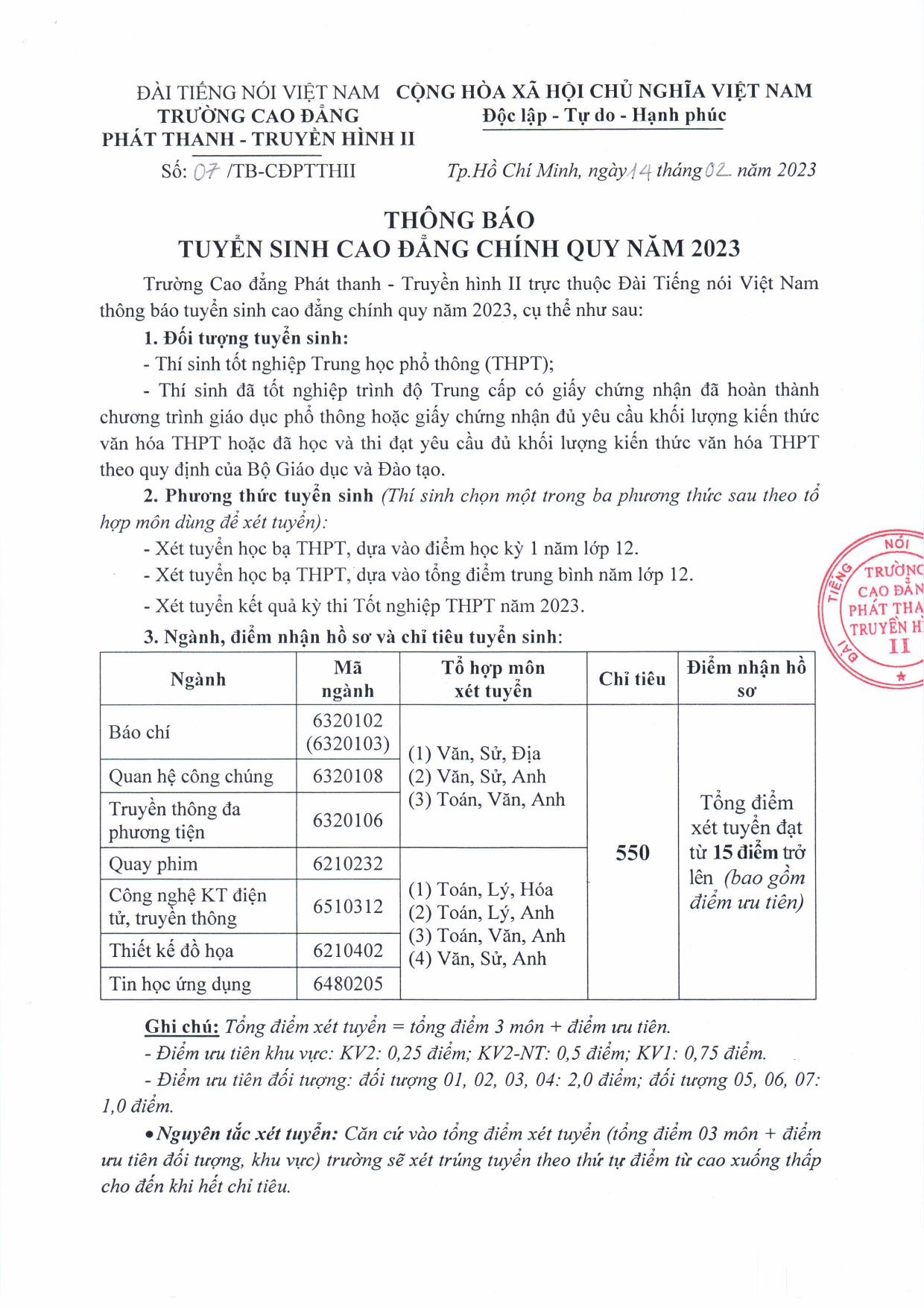 Trường Cao đẳng Phát thanh - Truyền hình II trực thuộc Đài Tiếng nói Việt Nam thông báo tuyển sinh cao đẳng chính quy năm 2023, cụ thể như sau: