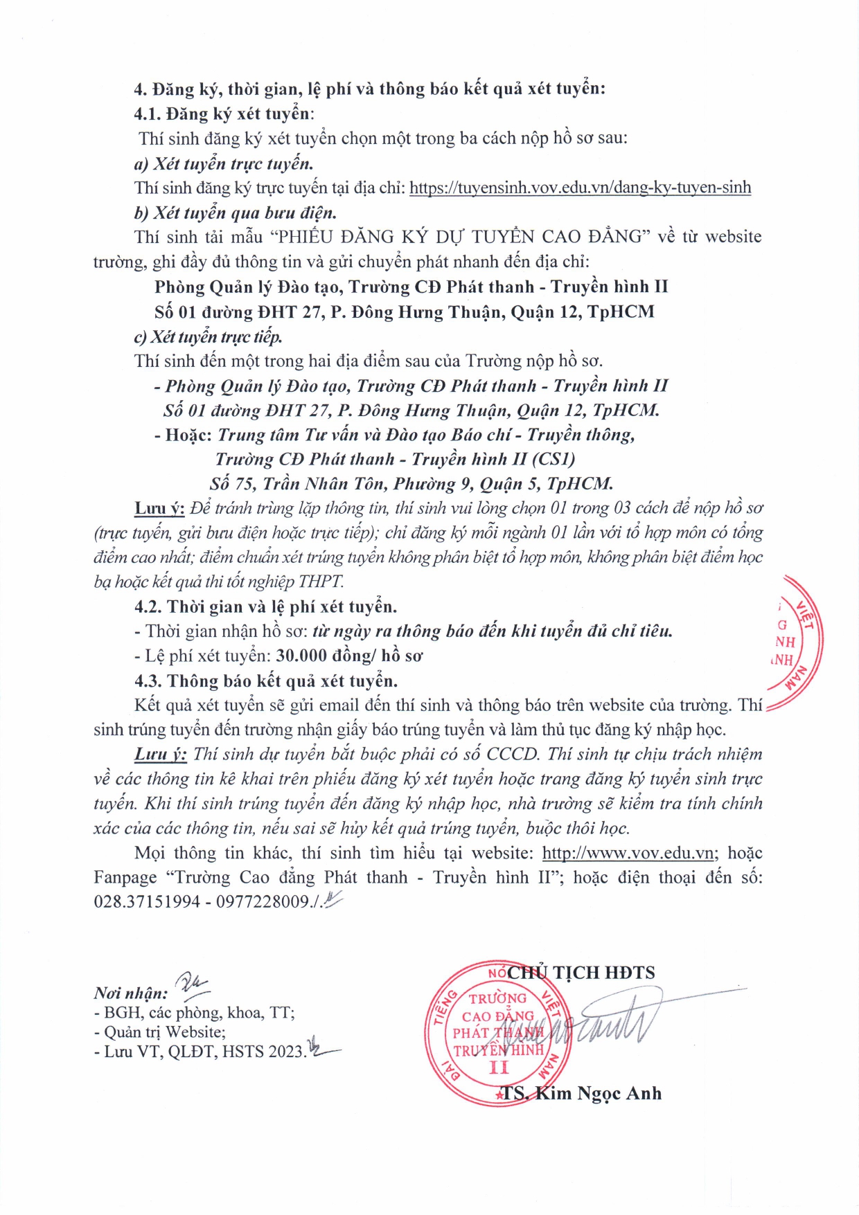 Mọi thông tin khác, thí sinh tìm hiểu tại website: http://www.vov.edu.vn; hoặc Fanpage “Trường Cao đẳng Phát thanh - Truyền hình II”; hoặc điện thoại đến số: 028.37151994 - 0977228009./.