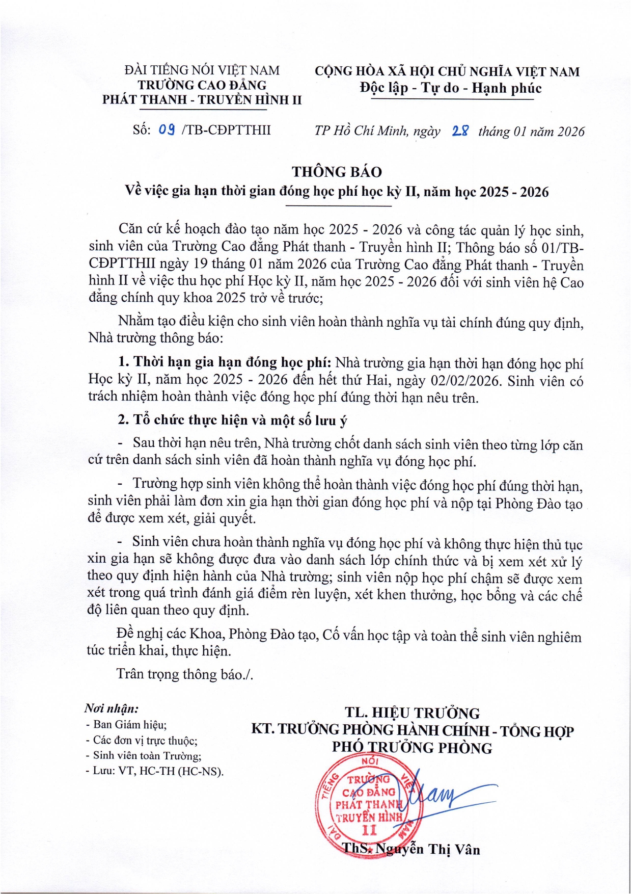 Thông báo về việc gia hạn thời gian đóng học phí học kỳ II, năm học 2025 - 2026